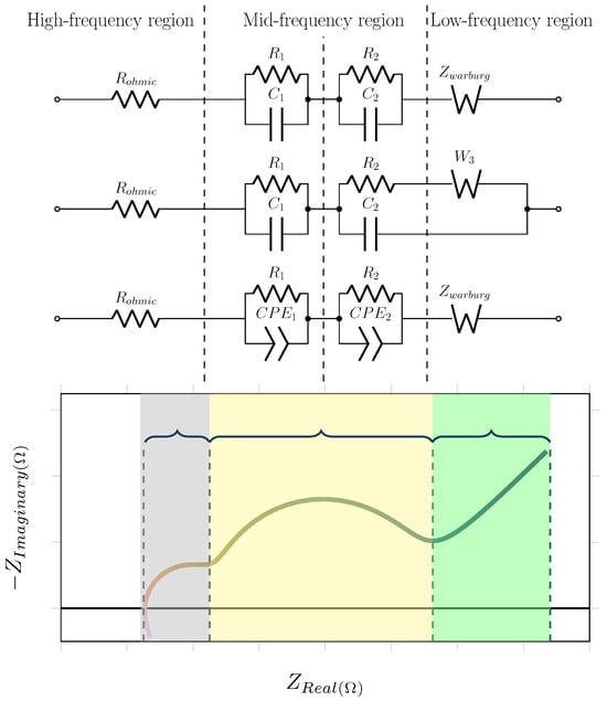 The diverse behavior of the battery impedance across distinct frequency ranges is effectively captured using suitable ECMs (top) adapted with permission from []. The figure showcases the interconnected parameters that correspond to various regions of the Nyquist plot of a randomly selected Li-ion cell (bottom). This depiction comprehensively illustrates impedance spectroscopy spanning a broad frequency spectrum from mHz to kHz. The semi-circle in the high-frequency range predominantly indicates the impact of the film’s resistance and capacitance, while the arc in the medium-frequency range is caused by the charge-transfer resistance and the capacitance of the double layer. The linear slope at the low-frequency end is attributed to the diffusion impedance.