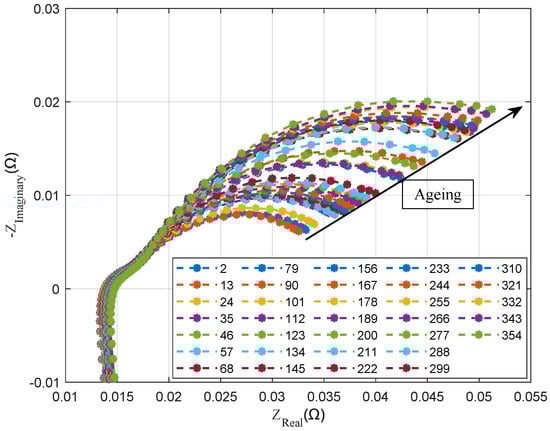 The ECM model can be used to link each electrical element with the three common degradation modes of the battery, each reflected in a response in a different frequency range [,]. The high-frequency region (kHz range) is usually modeled with series resistance and an inductor. The degradation mechanism affecting this region is the loss of lithium inventory, causing electrolyte decomposition. In the mid-frequency region, commonly modeled by RC networks, the degradation mechanisms that will lead to a change in the ECM are loss of active materials in the anode and cathode and the growth of a solid electrolyte interface (SEI). Finally, the low-frequency range shows the diffusion process, which is represented in the ECM model with a Warburg or a constant phase element (CPE). The diffusion process is related to the battery degradation by loss of active material in the cathode that will lead to a change in the electrode’s formation [].