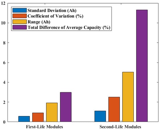 One of the main challenges in SLB implementation is ensuring battery cell consistency and stability in terms of capacity, voltage, and internal parameters []. Furthermore, the history of the battery’s first life, including cyclic aging and the operating temperature, should ideally be considered to determine its suitability for SLB applications, but this information is usually unavailable, unfortunately. All these aspects make the screening process for second-life batteries complex and multi-disciplinary, requiring expertise in battery technology, electrical engineering, and data analysis.