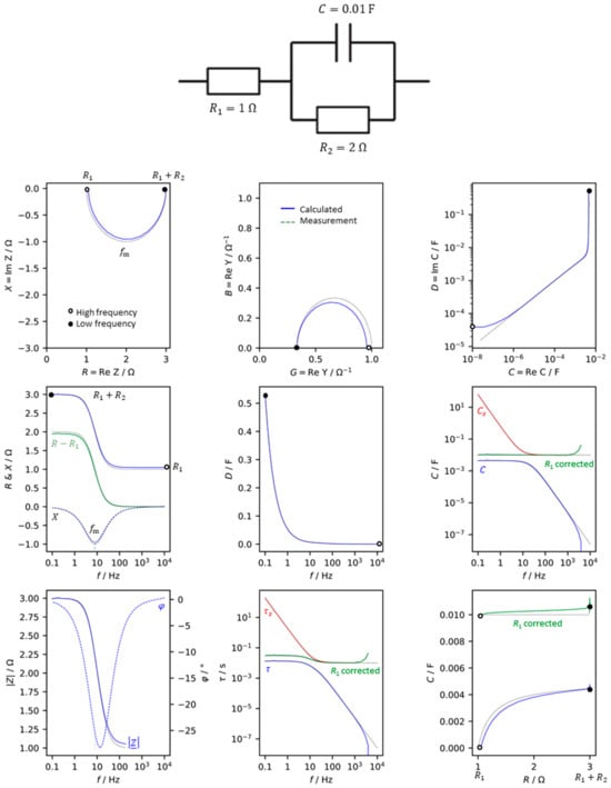Moreover, Figure 1 compares the simulated values of the network (Equation (10)) with the measurement of a real electrical circuit. Apart from the tolerances of the real components, there are small deviations at high frequencies, which are obvious due to the inductive behavior of the capacitor winding, cables, contacts, and resistive materials. In practice, the capacitance of the electrolytic capacitor used is a frequency-dependent quantity.