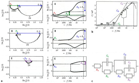 Stepwise impedance spectrum analysis. (a) The impedance spectrum of a lead dioxide electrode (PbO2|Ti) in sulfuric acid at a current density of 8.5 mA cm−2. (b) The pseudocapacitance, corrected by the electrolyte resistance and the charge transfer resistance. (c) The equivalent circuit derived from the stepwise analysis according to Equations (11)–(15): e = electrolyte, L = inner layer between titanium support and PbO2 active layer, D = double layer and charge transfer reaction, 0 = residual faradaic impedance. Correction steps: A electrolyte, B inner layer, C charge-transfer.