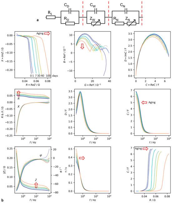 Accelerated aging test of a supercapacitor (Vinatech HyCap Neo, 10 F, 2.7 V, Jeonju, Republic of Korea). (a) Equivalent circuit: RS = electrolyte, RD = grain boundaries and charge transfer, CD = double layer, ZW = Warburg impedance: loss of active surface area by pore clogging and growing interlayer between carbon and aluminum support, ZN = Nernst diffusion impedance attributed to mass transfer (adsorption of ions on porous carbon electrodes and ion depletion at electrode/electrolyte interface). (b) Measured impedance in frequency range between 0,1 Hz and 10 kHz in different diagram types. Mathematical convention. R = resistance, X = reactance, G = conductance, B = susceptance, C = capacitance, D = dissipation, |Z| = impedance modulus, φ = phase shift, τ = time constant. The red arrows show the trend of the changes during aging.