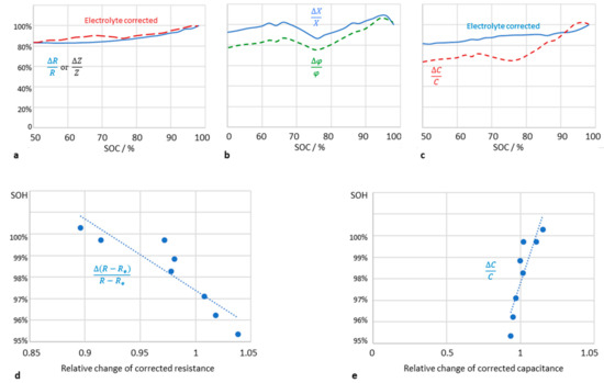 The electrolyte resistance is not recommended for the determination of the SOC, but it is useful as an aging indicator for SOH monitoring. Therefore, the measured real parts are corrected by subtracting Re (the real part at a high frequency, where X = 0). The linear trend between the pseudocapacitance and electric charge is better when the electrolyte resistance is corrected.