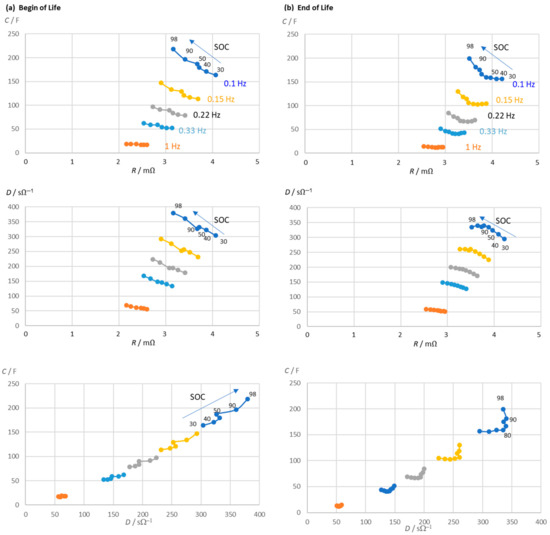 - The ohmic resistance at medium frequencies—for instance, R(1 Hz) or R (0.1 Hz)—is often correlated with the battery capacity and the SOH [42,43,44]. However, the resistance reflects the growth of the passive layer (SEI) and the decomposition of the electrolyte, rather than the actual available capacity. In the complex plane, one or two depressed semicircles are visible (see Section 3.2). The low-frequency region (<0.1 Hz), which represents the diffusion processes at the two electrodes, is often neglected because of the longer time required to measure the impedance at low frequencies.