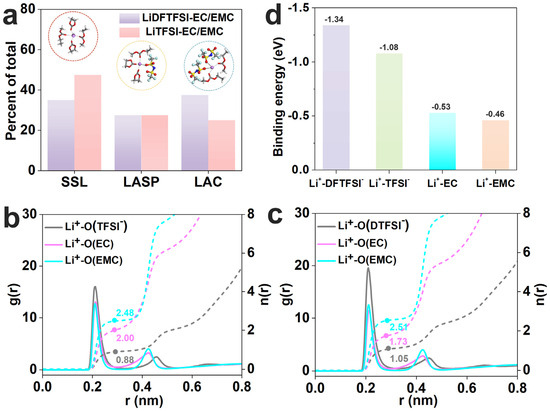 cMD simulations were carried out to investigate the specified solvation structure of the LiDFTFSI-EC/EMC electrolyte caused by the asymmetric structure. The solvation structure of an electrolyte is determined by its molecular structure, which can be distinguished into three categories [32,49]: (1) solvents surrounding Li+ (SSL), (2) Li+–anion single pairs (LASPs), and (3) Li+–anion clusters (LACs). A strong Li+–solvent interaction should be avoided as it inhibits desolvation and triggers solvent cointercalation during Li+ reduction while charging [50]. Comparisons of solvation structures between LiDFTFSI and LiTFSI are as shown in Figure 1a and Figure S3a. Based on Li+ coordination with oxygen, the proportions of SSL, LASP, and LAC in the LiDFTFSI system are 35%, 27.5%, and 37.5%, respectively, while in the LiTFSI system, these are 47.5%, 27.5%, and 25%, respectively. Thus, the proportion of SSL in the LiDFTFSI system is much lower than that in the LiTFSI system. The significant increase in the proportion of LAC solvation structures suggests a shift in the solvation structure from SSL to LASP and LAC.