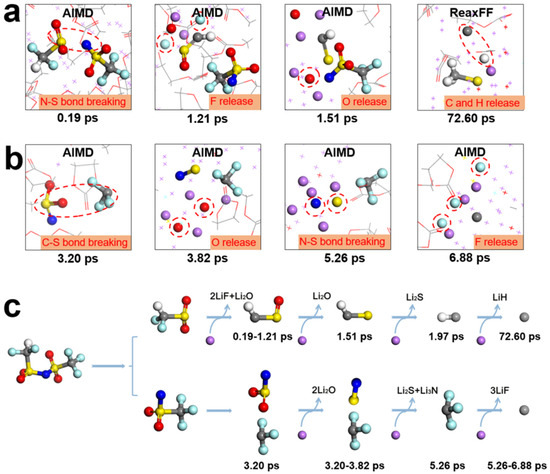 On the other hand, the –CF3 group detached from the salt at 3.20 ps through C–S bond cleavage, similar to a previous report [44]. Further reduction of DFTFSI−, followed by S–O, N–S, and C–F cleavages, contributed to the inorganic components of the SEI (Figure 2b). Breaking of the N–S bond occurred at 5.26 ps, and all F atoms were released from DFTFSI− at 6.88 ps (Figure 2b). The results show that the –CF3 group decomposes later than –CF2H, indicating that the introduction of the asymmetric substitution of H atoms further enhances the reactivity of –CF2H. This detailed mechanism demonstrated that asymmetric DFTFSI− can rapidly react with Li0 and generate products, including LiF, Li2O, and Li3N, which can potentially improve ionic conductivity, regulate the mechanical properties of the SEI, and inhibit dendrite formation [11]. The decomposition mechanism of DFTFSI− revealed by the AIMD simulation supports the experimental hypothesis, as illustrated in Figure 2c and Figure S4.