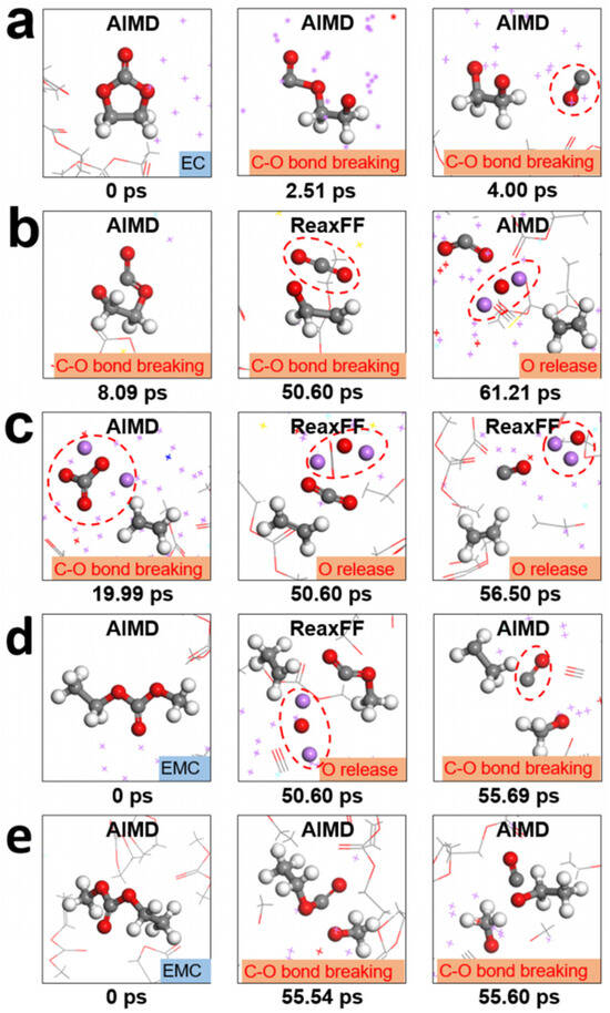 The decomposition of EMC is slower than EC and generally falls into two categories. As shown in Figure 3d, the C–O bond breaks with Li2O at 50.6 ps, and then the C–O bond breaks, leading to the formation of CO and CH3O− at 55.69 ps. The other reaction path involves the initial detachment of the –OCH3 group from the carbon chain via a one-electron reduction, followed by the breaking of the C–O bond in the remaining –OCOCH2CH3 species, yielding CO and C2H5O− (Figure 3e). EMC decomposition did not occur in the first 50 ps of the AIMD simulation but began in the early stages of the HAIR simulation, revealing a similar reaction mechanism.
