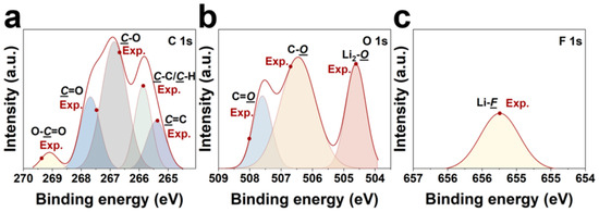 XPS of the LiDFTFSI-EC/EMC system. (a) C 1 s, (b) O 1 s, and (c) F 1 s. The experimental binding energy shifts in C 1 s, O 1 s, and F 1 s are marked with red dots [55,56,57,58].