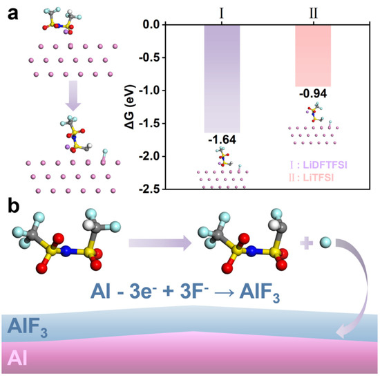 LiDFTFSI defluorination achieves passivation of Al. (a) ΔG of defluorination of the lithium salt on the Al (111) surface, and (b) a schematic diagram of LiDFTFSI passivating Al. Color codes are the same as in Figure 1a.