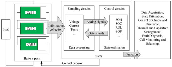 Numerous battery types have been utilized, with the lithium-ion battery (LIB) [15,16] gaining attention from both research communities and the automotive industries due to its exceptional attributes, including its high energy density, low self-discharge rate, elevated voltage, extensive lifespan, remarkable reliability, and rapid recharging capabilities. To maintain safe operating conditions, a battery management system (BMS) is employed, responsible for determining optimal charging and discharging times. Figure 1 illustrates the typical structure and functions of the BMS, which involve collecting operational data from the battery pack, processing this information to estimate the battery’s current state, and subsequently regulating the battery in alignment with the estimated parameters.