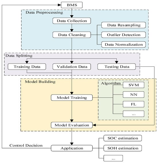 Joint estimation of SOH and SOC is crucial, with capacity-based and resistance-based SOH estimation processes playing a significant role in updating SOC estimation. Researchers categorize ML algorithms for battery state estimation into non-probabilistic and probabilistic methods, with studies emphasizing non-probabilistic algorithms, including neural networks, support vector machines, fuzzy logic, and their derivatives. This section provides a comprehensive overview of ML techniques for SOC and SOH estimation, offering comparisons. The overall workflow can be seen in Figure 6.