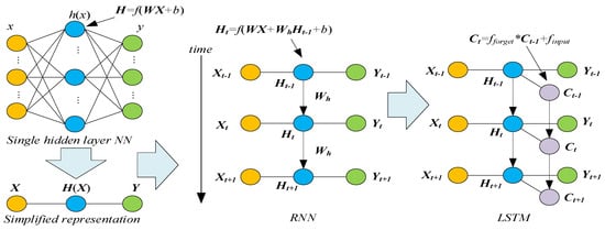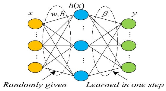 The FFNN algorithm, which relies on gradient descent, may exhibit slow performance and demand extensive computational resources. The extreme learning machine (ELM) was introduced to address this issue. The ELM is built upon feedforward neural networks [92] and can encompass single or multiple layers of hidden nodes. These nodes serve various purposes such as classification, regression, clustering, sparse approximation, compression, and feature learning. In an ELM, the parameters of these hidden nodes can be configured. These hidden nodes can either be randomly selected and remain unaltered or be passed down without modifications. Typically, the output weights of the hidden nodes are trained in a single step, akin to learning a linear model. As shown in Figure 7, w and b are randomly given and will never be changed; only β is learned in a single step, while these parameters need to be solved and consume a lot of computational resources. Obviously, this greatly improves the solution efficiency of the neural network.