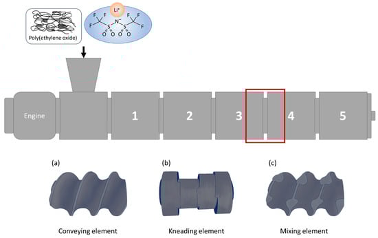 All extrusion experiments are carried out in an argon-filled glovebox (H2O and O2 < 1 ppm) with a co-rotating, intermeshing, twin-screw extruder with a total screw length of 576 mm (ThreeTec, Seon, Switzerland). The twin-screw has segmental screw elements with a length of 36 mm per screw segment. Different screw elements can be placed at a desired location along the screw. The screw design was varied by changing the screw elements between heating zone 3 and 4 (see Figure 1). The screw elements used in this work were conveying elements (screw design A), kneading elements (screw design B) and mixing elements (screw design C). The screw elements are identical in the basic construction and differ only in their functionality. Each element has a pitch of 24 mm, a L/D of 24/36, a thread angle of ~17.7° and a do/di of 24/16. The main difference is that the kneading elements have a 4 × 60° angle block construction and the mixing elements have mixing shafts along the length of the screw element. As mentioned above, these elements are assembled in the screw design, where we expect a complete melting of the PEO, so the assumed dominant force is the viscous energy dissipation (VED). A 3 mm string nozzle was used to shape the polymer electrolyte and to improve sample extraction.