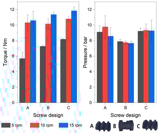 The left diagram in Figure 2 shows the measured torque for the three screw designs (A, B and C) as a function of the applied screw speeds. It is clearly visible that the torque increases with the applied screw speed for all three screw designs. The smallest error bars and, thus, the most stable process can be observed for all three screw designs at a low screw speed of 5 rpm. Here, screw design A shows the largest (±0.82 Nm) and screw design C shows the smallest (±0.09 Nm) error bar. At low screw speeds, the residence time of the material in the extruder barrel is longer. The longer the residence time of PEO in the extruder barrel, the more time PEO has to melt and to dissolve LiTFSI. This applies for any screw design. Due to the plasticizing effect of LiTFSI [47] and by enhancing the flowability of PEO, less energy is required to transfer the material through the barrel. However, screw design B shows a smaller error bar at 15 rpm than at 10 rpm. Here, the screw speed and the higher energy input of the kneading elements compared to the other screw designs reduce inhomogeneities in the melt and improve the mixing and dissolving of LiTFSI. This allows the engine of the extruder to maintain the energy required to keep the screw speed more stable.