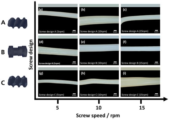 The best mixing is shown for screw design B with an applied screw speed of 15 rpm (Figure 4,f). Here, the kneading elements and the high shear stress improve the mixing and dissolution of LiTFSI in the PEO matrix, which is also characterized by the lowest pressure in Figure 2. In comparison, screw design C (Figure 4i), with an applied screw speed of 15 rpm, shows the yellowest sample indicating poor mixing. Despite the use of mixing elements, this screw design does not seem to be suitable for the extrusion of PEO:LiTFSI electrolytes, especially at high screw speeds.