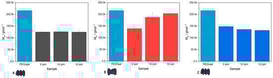 Molecular weight of extruded PEO:LiTFSI electrolytes dependent on the screw design and the applied screw speed compared to the molecular weight of pristine PEO. The light blue bar with a pattern is the determined Mw for pristine PEO and is used for all three diagrams as a reference. The bars representing the determined Mw of the PEO:LiTFSI-electrolytes are colored in gray, red, and blue for a better assignment to the screw designs A, B, and C, respectively.