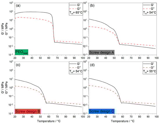 Temperature-dependent storage modulus G′ (solid line) and loss modulus G″ (dotted line) for neat PEO and extruded PEO:LiTFSI electrolytes with different screw designs at a screw speed of 15 rpm. (a) neat PEO; (b) PEO:LiTFSI electrolyte extruded with screw design A; (c) PEO:LiTFSI electrolyte extruded with screw design B; (d) PEO:LiTFSI electrolyte extruded with screw design C.