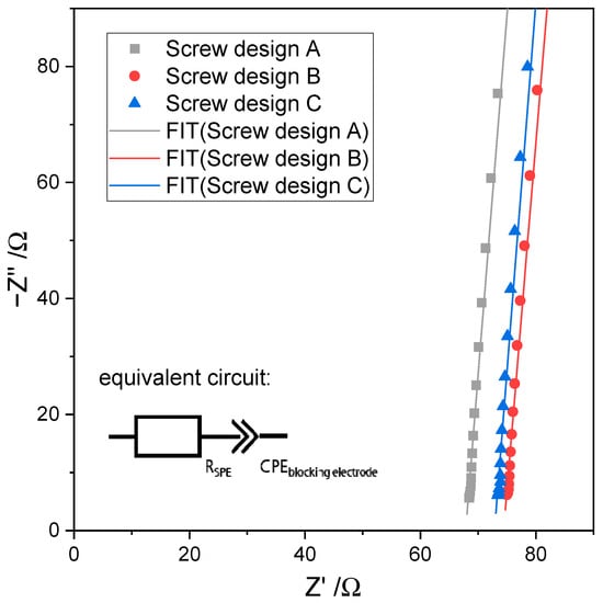 Exemplary Nyquist plot of impedance measurement of PEO:LiTFSI electrolytes at 80 °C extruded with different screw designs and an applied screw speed of 15 rpm; measured thickness of electrolytes screw design A: 0.292 µm, screw design B: 0.362 µm, screw design C: 0.275 µm.