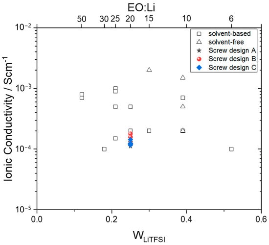 As shown in Figure 7, all impedance data are fitted with an equivalent circuit consisting of an RSPE and a CPE element. The resistance RSPE is usually attributed to the ionic resistance originating from the polymer electrolyte and the CPE element to the blocking electrodes. The conductivity can be calculated from the determined R considering the sample geometry. Figure 8 shows the σionic for PEO-based electrolytes as a function of their molar ratio (EO:Li) and their preparation extracted from the literature [13,33,49,50,51,52,53,54]. The diagram clearly shows that solvent-based electrolyte preparation is still widely used in research as solvent-free preparation methods covering a wide range of mixing ratios. The solvent-based prepared electrolytes presented are generally prepared by solvent casting of dissolved PEO and LiTFSI in acetonitrile [49,54,55,56]. The solvent-free preparations are performed by mechanical mixing or hot pressing at 100–120 °C [33,51,52] or simple pressing [53] of the components. Nevertheless, the presented σionic shows no clear trend depending on the sample preparation. Thus, it is even possible to compare the σionic of electrolytes produced in this work with the σionic electrolyte prepared by the solvent-based method. Overall, all produced PEO:LiTFSI electrolytes show an σionic between 1.1 × 10−4 S cm−1 and 1.8 × 10−4 S cm−1 at 80 °C, which is comparable to the literature indicating successful production of PEO-based electrolytes. Furthermore, although all the produced PEO-based electrolytes show a decrease in Mw after extrusion, the Mw seems to be high enough to not affect the σionic of the electrolytes. This is in good agreement with the findings of Hallinan et al. where the authors present an exponential relationship between σionic and Mw, when Mw < 2000 gmol−1 [57]. PEO-based electrolytes with Mw > 2000 gmol−1 have no influence on the σionic.