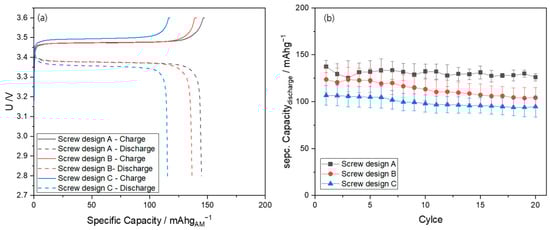 For the investigation of the electrochemical behavior of the PEO:LiTFSI electrolytes produced, cycling tests were performed in a 2032-coin cell setup. Figure 9a depicts the charge and discharge curves at 80 °C for the first cycle in the potential window of 2.8 V to 3.6 V vs. Li+/Li depending on the screw designs used. All three cells show the characteristic charge and discharge plateau of LFP at around 3.4 V. The specific capacity achieved varies with the screw design used. While the full cell with the PEO:LiTFSI electrolyte produced with screw design A reaches a specific capacity of 145 mAh g−1, the cells with PEO:LiTFSI electrolyte produced with screw design C reaches the lowest specific capacity of 115 mAh g−1. The theoretical capacity of 150 mAh g−1 of LFP was not achieved by any of the systems studied. A possible reason for this is the use of a conventional cathode structure without additional catholyte, which might prevent the complete infiltration of the cathode layer. This means that not all active material particles are reached and contribute to the achieved capacity of the cells. These results are in agreement with the thermo-mechanical properties of the PEO:LiTFSI electrolytes. The lower specific capacity for screw design C can result in a higher resistance of the PEO:LiTFSI electrolyte. This resistance is characterized by the higher G′ and G″ values at 80 °C compared to the electrolytes produced with the other screw designs. In addition, the lower calculated σionic for screw design C, which allows for less Li-ion migration during the charge and discharge, can also result in a lower specific capacity. Comparing the charge curves of the screw designs, the higher resistance of the electrolyte of screw design C may also be responsible for the shift of the characteristic plateau of LFP to higher potentials.