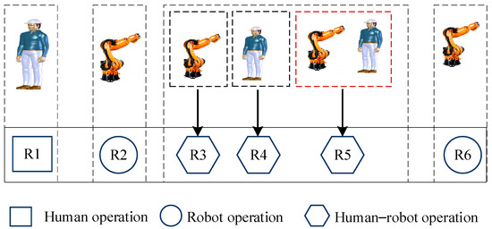 Human–robot collaborative disassembly (HRCD) means that the cooperative robot and the worker are assigned to the same station and complete some disassembly tasks together with the worker. Depending on the execution logic of the task in the workstation, the HRCD has different distribution patterns. Human–robot collaborative asynchronous parallel disassembly means that the employee and the cooperative robot are assigned to the same station, and the two can cooperate to complete the same task, or they can perform different tasks in parallel. When the task is executed in the human–robot cooperative mode, both workers and robots must be idle at the same time. When the task is completed, the worker and the robot perform other tasks in parallel. To further illustrate the disassembly mode allocation, Figure 2 shows a schematic of the human–machine hybrid parallel disassembly mode for six tasks. Tasks 3, 4, and 5 are assigned to the human–robot collaboration station. Task 3 involves a disassembly process that is primarily carried out by robots. In contrast, Task 4 encompasses a collaborative, human-centered approach to dismantling. Task 5 indicates that both humans and robots have decision-making abilities when executing tasks.