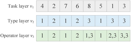 The problem of parallel disassembly sequence planning involves not only the constraint relationship between disassembly tasks but also the disassembly mode and the assignment of disassembly operators. Therefore, this work adopts multi-segment structure coding. In multi-segment structure coding, each drosophila individual is composed of a disassembly task segment, disassembly mode segment, and operator segment. For the disassembly task layer , n indicates the total number of disassembly tasks. Each element represents a task to be disassembled. For the type of disassembly layer , each element represents the disassembly mode corresponding to the disassembly task in , that is, human disassembly, robot disassembly, and human–robot collaborative disassembly. For the operator layer , each element represents the operator performing the corresponding disassembly task in segment . When the corresponding disassembly mode is worker disassembly or robot disassembly, each element represents an operator, that is, a worker or a robot. When the corresponding disassembly mode is human–robot collaborative disassembly, each element represents two operators, that is, a worker and a robot. The coding process is shown in Figure 3, where three operator types perform the disassembly operation. For the type layer, type 1 pertains to the exclusive execution of tasks by humans. On the contrary, type 2 denotes solitary task performance by the robot. Type 3 signifies a collaborative effort between humans and robots in executing tasks. As for the operator layer, tasks {4, 7, 5} are dismantled by humans. Tasks {2, 6} are undertaken in the robot disassembly mode, with disassembly by a robot. Tasks {8, 1, 3} are in the human–robot collaborative disassembly mode, which is disassembly by humans and robots. It is worth noting that Task 8 is a human-centered HRCD with operation codes (1, 3). Task 1 is an HRCD centered on robots, with operation codes (2, 3). In addition, Task 3 is an equivalent HRCD with operation codes (3, 3).