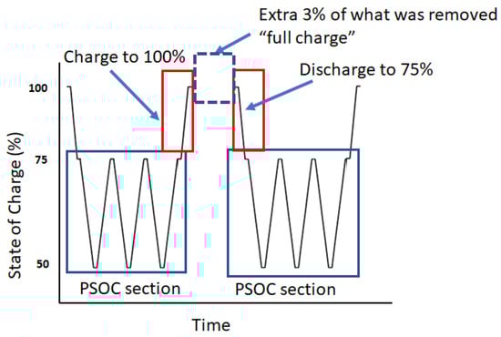 SOC graph showing the partial-state-of-charge cycling section, followed by the full charge and return to partial-state-of-charge cycling. N.B. each PSOC discharge and then charge counts as one cycle.