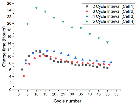 In the first 50 cycles, the charge times observed from the cells were highly variable, irrespective of the full-charge interval, and every regime required different charge times. The same pattern was seen on each cell. This was, as shown in Figure 2, the first cycles having charge times that were lower, then increasing as cycling progressed, and then showing a decreasing trend, which appears to level off towards the end. The exact cause of this is unclear; however, it is potentially due to the capacity test providing a more complete full charge than the 1.03 charge-factor-controlled full charge.