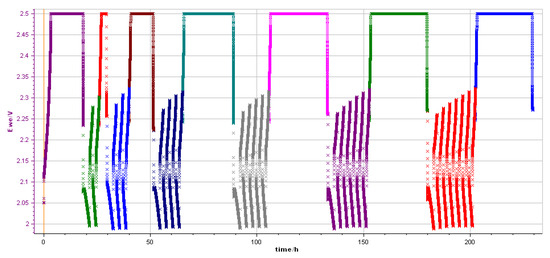 The cell originally tested on the two-cycle-interval regime, due to more frequent full charges, took longer to cycle and, as such, was not able to be restarted for the second set of 50 cycles. This was stored fully charged and open circuit for approximately 2 months and then used in a variable-interval cyclic test. Even though the cell was stored at full charge, the cell was recharged to correct any self-discharge using a 630 mA constant-current–constant-voltage (CC/CV) 2.50 V charge, time limited to 15 h, which was achieved with a Biologic SP-300 single-channel cycler.