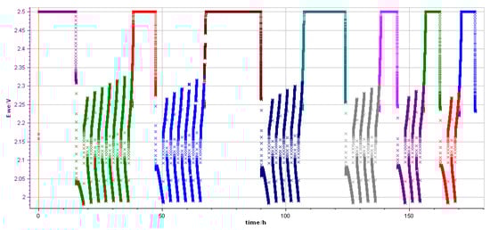 Because the history of charges clearly affected the charge times of the cell, a further test was proposed: a reverse of the above test on the same cell, starting with a seven-cycle interval and reducing to two cycles. This commenced following another open-circuit storage time of 1 month and a 15 h recharge. The voltage profile of this test is shown in Figure 5. There is a trend towards lower charge times as the cycling progresses and the number of cycles between full charges decreases. Of note is the first charge time of this test, following seven PSOC cycles, which is approximately three times faster than the full-charge time of the seven cycles experienced in the first variable-interval test.
