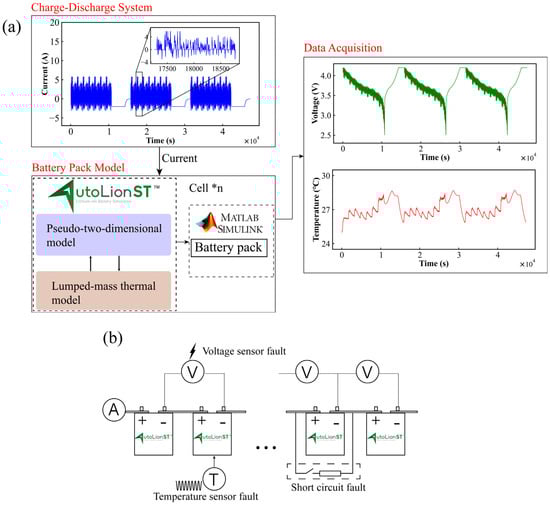 Figure 3. Schematic diagram of the virtual battery pack experiment: (a) Schematic diagram of the battery pack charging and discharging test; (b) schematic diagram of the different fault tests.