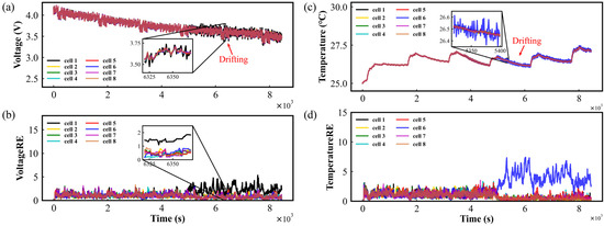 Figure 5. Results of sensor faults under FUDS conditions: (a) Voltage curve of each cell; (b) Voltage relative entropy curve of each cell to that of the reference cell; (c) Temperature curve of each cell; (d) Temperature relative entropy curve of each cell to that of the reference cell.