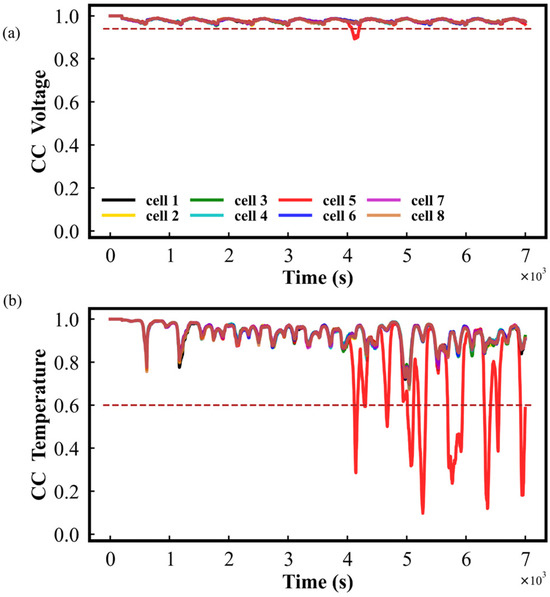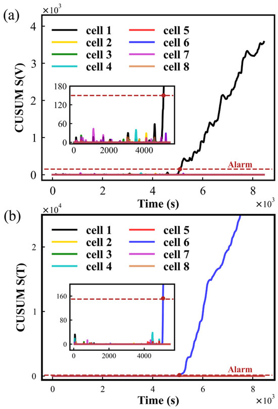 When only one sensor (either voltage or temperature) shows abnormal data, we attribute it to sensor malfunction. It is only when both sensors on the same battery simultaneously exhibit abnormal readings that we attribute the fault to the battery itself. Therefore, upon detecting sensor faults, we do not attempt to correct the data from these faulty sensors. Instead, we discard the data generated by these faulty sensors and issue a warning. The sensor fault test was carried out by injecting a large amount noise into the original measurement data. The results of the voltage sensor fault on cell 1 and the temperature sensor fault on cell 6 under FUDS are depicted in Figure 5a,c, respectively. Because most of the sensor faults were drifting, here noise was used to simulate the fault. The noise was injected at time of 5000 s. From Figure 5a,c, one can observe that before the sensor fault happened, the measured voltage of cell 1 and the measured temperature of cell 6 fluctuated within a small noise range, just like the other cells. With noise disturbances of 0.02 V for voltage and 0.2 °C for temperature to the measurement signal, the sensor accuracy was apparently distorted, but it is difficult to detect this using the conventional threshold methods. Furthermore, the relative entropies of the voltage and temperature of each cell to the reference cell were calculated in sensor fault conditions, as shown in Figure 5b,d. From Figure 5b, it can be seen that the voltage relative entropy of cell 1 gradually deviates from that of the other cells after 5000 s. Similarly, in Figure 5d, the temperature relative entropy of cell 6 follows the same trend as the voltage relative entropy in Figure 5b. By comparing the relative entropy of cells at normal and fault, it can be indicated that the relative entropies of normal cells are not always kept at the minimum but fluctuate in a small range. Furthermore, the CUSUM method was applied to reduce the impact on sensor fault diagnosis; the result is shown in Figure 6. One can see that when the CUSUM of relative entropy exceeded a preset threshold, the voltage sensor fault was detected at 93 s after voltage disturbance was added to cell 1 and the temperature sensor fault was detected at 65 s after temperature disturbance was added to cell 6, which indicates that the sensor fault can be detected and located in a short time using our proposed method.