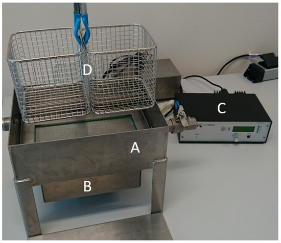 Figure 1. Ultrasonic bath (A) with ultrasonic oscillator (B), frequency generator (C) and stainless-steel basket (D) to position the sample plates.