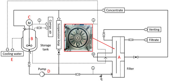 Figure 2. Process flow chart of the plant for dynamic cross-flow filtration. With the filter (A), a stirred storage tank (B + C), a peristaltic pump (D) and a cooling water periphery (E) to cool the suspension, as well as the mechanical seal of the filter.
