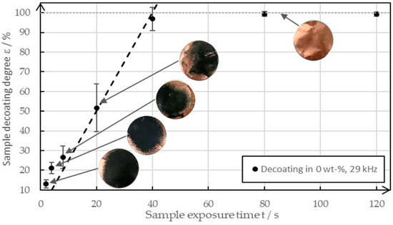 It was easy to see that the degree of decoating increased almost linearly until it reached almost 100%. After that, it increased only minimally in the time interval and approached a degree of decoating of 100%. The images of the sample plates show that the decoating spread from the edge. The reason for this behavior was the raised surface, which provided cavitation nuclei. The image of the cleaned copper foil illustrates the high purity of the copper, which can leave the recycling process as a recyclable material after the decoating process. It can be assumed that a similar behavior is shown with increased solid concentrations, except that the gradient of the straight line was found to decrease, and thus decoating levels of >95% were achieved later. Due to the manual placement of the samples in the ultrasonic bath and inhomogeneities in the ultrasonic field, the degrees of decoating varied despite the same test parameters. When high degrees of decoating are achieved, small deviations appear as the time is sufficient for complete decoating anyway. The errors are distinct in the area of medium decoating degrees as small differences in the homogeneity of the coating and the ultrasonic field lead to high deviations in the degree of decoating.