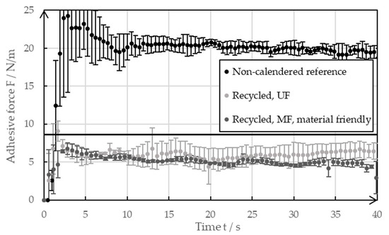 Figure 9 presents the outcomes of the 90° peel test that was conducted on the negative electrode foils coated with the reference paste or the recycled pastes of both the MF and UF passes. No calendering of the coatings took place during the tests. After wet coating, all the samples were dried at room temperature for at least 48 h. The solid line at 8 N/m represents a reference of the industrially produced foils of the negative electrode after drying at 32 °C [20]. Large error bars appeared at the beginning and toward the end of the measurements as the peel test did not take place in steady state.