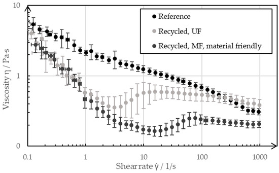 Figure 9 also indicates that the adhesive strengths of foils coated with a recycled paste were lower compared to those coated with a pristine slurry. The lower adhesive strengths suggest that the recycling process may have affected the binder’s integrity. The SBR binder could have partially lost its functionality due to the high shear forces in the ultrasonic bath and the filtration system. Additionally, ultrasonic-induced degradation of CMC is likely to have negatively impacted the adhesive forces, as it promotes the effect of binder migration due to changes of the viscosity. The influence of ultrasound on the paste viscosity is further discussed and evaluated in the rheological measurement section. The effects of binder migration can be seen in the SEM images. The adhesive forces from both recycling rounds ranged between 5 N/m and 8 N/m, with electrodes coated using the recycled paste from the microfiltration (MF) cycle showing slightly lower values. The microfiltration membrane, with a pore size of 1 µm, may have allowed some SBR to pass into the filtrate, reducing its availability in the recycled material to enhance coating adhesion. In contrast, the ultrafiltration membrane pores are too small for SBR loss. Overall, a negative impact of the recycling method on electrode adhesive strength was observed. It is likely that blending recycled material with fresh material could mitigate this effect. Alternatively, adding small amounts of fresh binder might produce electrodes with improved adhesive strength. Subjectively, the adhesive forces of the recycled electrodes were still sufficiently high to handle them similarly to the reference samples.