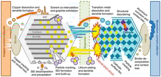 Electrolyte breakdown is the chemical reaction and deterioration of the electrolyte. Repeated cycles, high temperatures, or overcharging are some of the reasons that might cause this breakdown and result in the development of undesirable byproducts [98]. Increased internal resistance, capacity decline, and decreased overall performance in lithium-ion batteries are caused by electrolyte degradation [99]. The breakdown of the electrolyte, an essential aspect that facilitates ion transport between the positive and negative electrodes in lithium-ion batteries is a complicated process involving a variety of chemical and electrochemical events that affect the electrolyte’s usefulness and stability. The creation of a solid–electrolyte interface during the battery’s repeated cycles of charge and discharge is one important factor [100]. Even while the SEI is necessary for a battery to function normally, its constant expansion can obstruct ion transport and cause electrolyte degradation. Furthermore, high voltages can cause electrolyte breakdown, producing heat, gas, and unwanted chemical species that exacerbate breakdown, particularly when overcharging or at high temperatures.