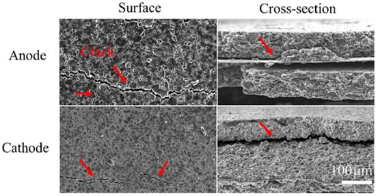 One of the main factors contributing to lithium-ion battery degradation is mechanical stress at the anode [56]. There is a number of negative consequences that might arise from mechanical stress on the anode. Initially, the anode material may experience physical damage from the stress, such as deformation or cracking, which would compromise its structural integrity and lessen its capacity to store and release lithium ions during cycles of charging and discharging [57]. Wang et al. investigated the mechanical stress on the anode and cathode and found cracks in both surface and cross-sectional areas [58], as shown in Figure 4. This damage may cause the internal resistance to rise, which would lower its overall performance and efficiency. Furthermore, mechanical stress could permit the electrolyte to penetrate the anode material and start chemical reactions that eventually weaken the anode and reduce battery capacity [50]. Moreover, internal short circuits brought on by stress-induced dendritic formation—a process in which microscopic lithium metal fibers protrude from the anode surface—can enter the separator and result in safety hazards like thermal runaway, overheating, or even explosions [51,52,53,59]. As the particles go through a phase transition, the intercalation of lithium ions into the anode may cause sudden variations in volume [60,61]. As more lithium is added, the orientation of the molecules shifts during a phase transition, producing distinct geometrical and electrical features. This results in mechanical stress brought on by a volume shift, which can cause contact loss with the composite electrode (CL), surface layer cracking (LLI and LAM), and anode structural damage (LAM) [62]. Electrode porosity, which is necessary for the electrolyte to reach the electrode’s bulk, may also decrease as a result of the active material’s volume change [21,63]. Different modeling techniques of stress factors of lithium-ion batteries have been presented in [64,65,66,67]. The hydrostatic stress of an anode can be evaluated using the following equations [59,68]:
