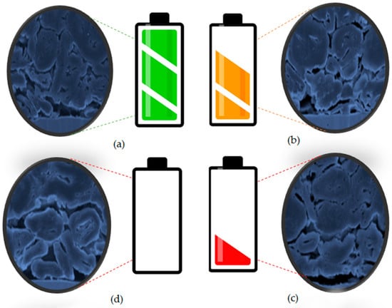 Cross-sectional image of capacity fade of lithium-ion battery, (a) fresh, (b) 1000, (c) 2000, and (d) 3000 cycles [119].
