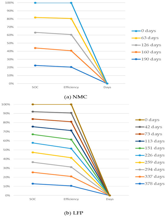 Efficiency degradation of lithium-ion cell due to calendar aging of (a) NMC and (b) LFP [124].
