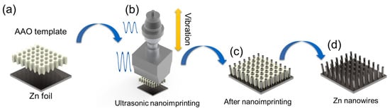 Schematic of Zn nanowire fabrication. (a) Prepared template and Zn foil. (b) Ultrasonic nanoimprinting process. (c) Assembly after nanoimprinting. (d) Fabricated Zn nanowire electrode.