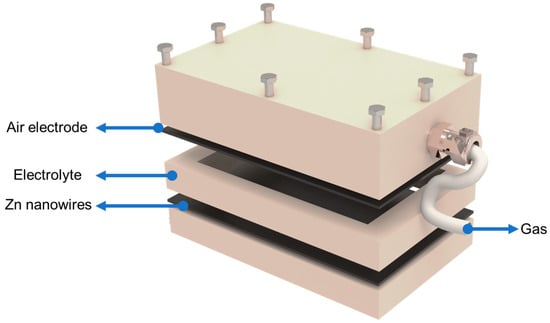The core element of the reversible electrochemical pneumatic battery is the zinc–air battery. In this battery, zinc is utilized as the anode, while the gas electrode functions as the cathode. The system uses a 6 M potassium hydroxide (KOH) solution as the electrolyte. Figure 4 provides a detailed illustration of the zinc–air battery structure.