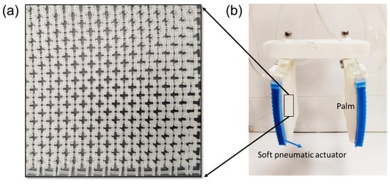 The gripper fabrication method is mentioned in our previously published paper [24]. To fabricate the gripper, first, the variable-stiffness materials-based fabric is designed by incorporating structured fabrics known as ‘European 4 in 1’, as shown in Figure 3a, which resemble chain mail and are integrated into the palm part [25]. In the palm part, each fabric piece is intricately woven into four neighboring frames in a consistent pattern. These components are fabricated using a stereolithography 3D printer, specifically the Formlabs Form3, with clear V4 resin. Each palm assembly includes two pieces of this fabric, which are securely sealed within an air-tight silicone elastomer bag. The silicone bag, made from Smooth-On Ecoflex 30, encases the fabrics in a rectangular shape, ensuring durability and flexibility.