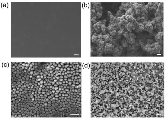 SEM images of Zn foil and Zn nanowires before and after reaction. (a,b) Zn foil before and after cycling measurements. Scale bars of (a,b) are 10 μm. (c,d) Zn nanowires before and after cycling measurements. Scale bars of (c,d) are 1 μm.