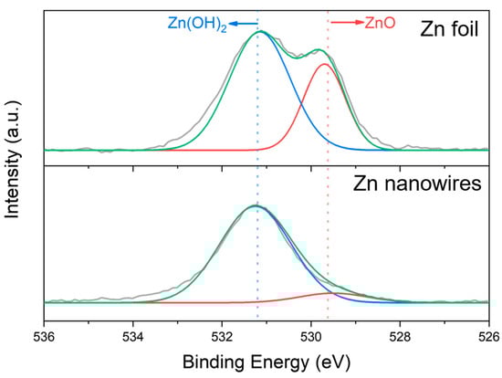 XPS spectra of O1s region for Zn foil and Zn nanowire samples after reaction. In this figure, the red line represents the peak related to ZnO, the blue line represents the peak related to Zn(OH)2, the green line is the fitted result, and the grey line is the measured result.