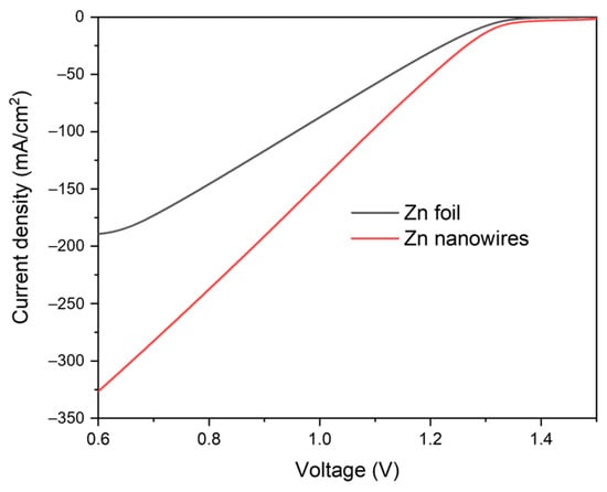 What is more, linear sweep voltammetry (LSV) results supported the conclusion as well, as shown in Figure 9. After 150 cycles, the discharging process LSV of Zn nanowires remains over 300 mA/cm2 in a single LSV scanning, whereas the Zn foil exhibits less than 200 mA/cm2. The current density of Zn nanowires is almost twice that of Zn foil. This indicates that, compared to Zn nanowires, the Zn foil shows worse performance with higher resistance and lower activation, resulting in a significantly lower current.