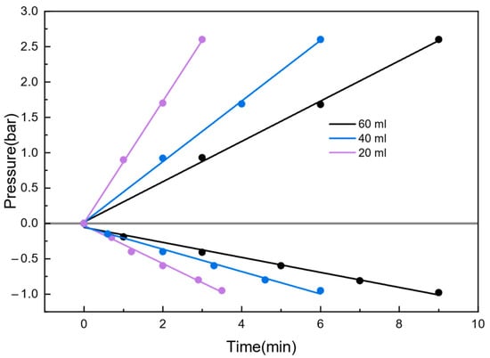 Relationship between pressure and time under different gas volumes.