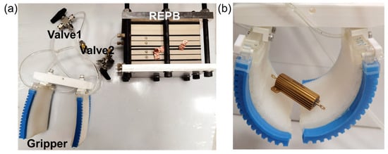 Here, the REPB cell’s gas outlet is connected to the gripper via tubing and valves, ensuring an airtight system. Initially, the REPB is charged by connecting its electrodes to an electrical power source. During this process, the gas chamber is linked to soft pneumatic actuators (the blue parts), and the generated positive pressure in the gas chamber bends the soft pneumatic grippers. This action also causes the variable-stiffness palm to bend appropriately, enabling it to grasp objects effectively. Subsequently, the REPB is connected to a variable-stiffness palm (the white parts) by adjusting the valve. It then discharges through a load to consume the oxygen inside the gas chamber, creating a vacuum that significantly increases the palm’s stiffness, enabling it to securely grasp objects. Figure 11b depicts the gripper grasping an object. The entire operation is motor-free, thus remaining exceptionally quiet. Although the REPB cell appears large, this is primarily because of the hard metal spacer needed to generate pressures above 10 bar for universal applications. However, in this scenario, only 120 kPa of positive pressure is necessary, allowing for a significant reduction in size if necessary.